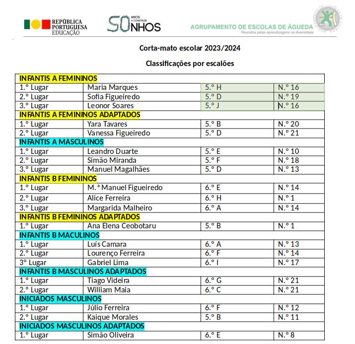 Para a fase distrital a realizar pela CLDE – Aveiro, ficaram apurados para representar o nosso Agrupamento (em data e local ainda a definir) os seguintes alunos, nos respetivos escalões: